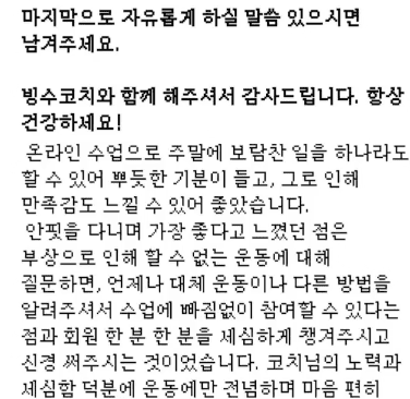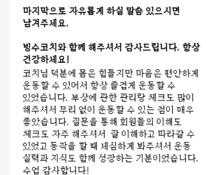 - 자극 부위 점검 & 동작 안내 : 운동 중 의도한 부위에 자극이 들어갔는지, 불필요하게 부담이 간 부위는 없었는지 등 수업 이후에도 질문을 받아 정확하게 답변 드립니다.